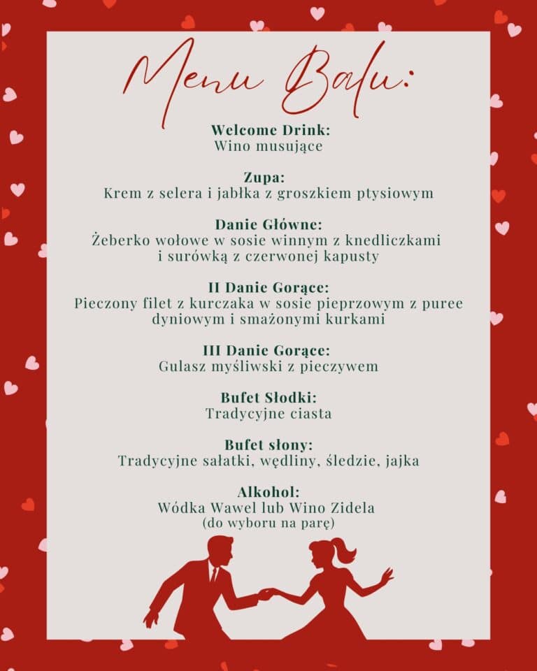 Czeka na Was 3-daniowa kolacja, bufet na ciepło, słodko i zimno, konkursy z nagrodami oraz zabawa do białego rana! Każda z par otrzyma od nas butelkę wina lub wódki (do wyboru). Bal rozpocznie się o 19:00 i potrwa aż do 5:00!